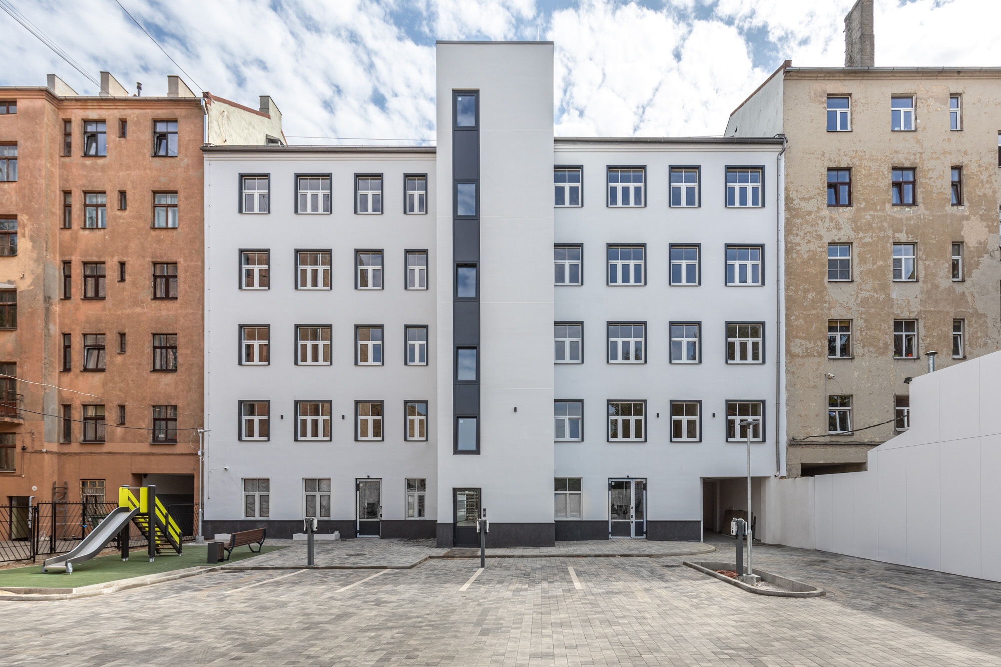Atrodas Rīgas centrā - Aleksandra Čaka ielā 123 un Krišjāņa Barona ielā 112, pie skaistā Ziedoņdārza, starp Tallinas un Artilērijas ielu.