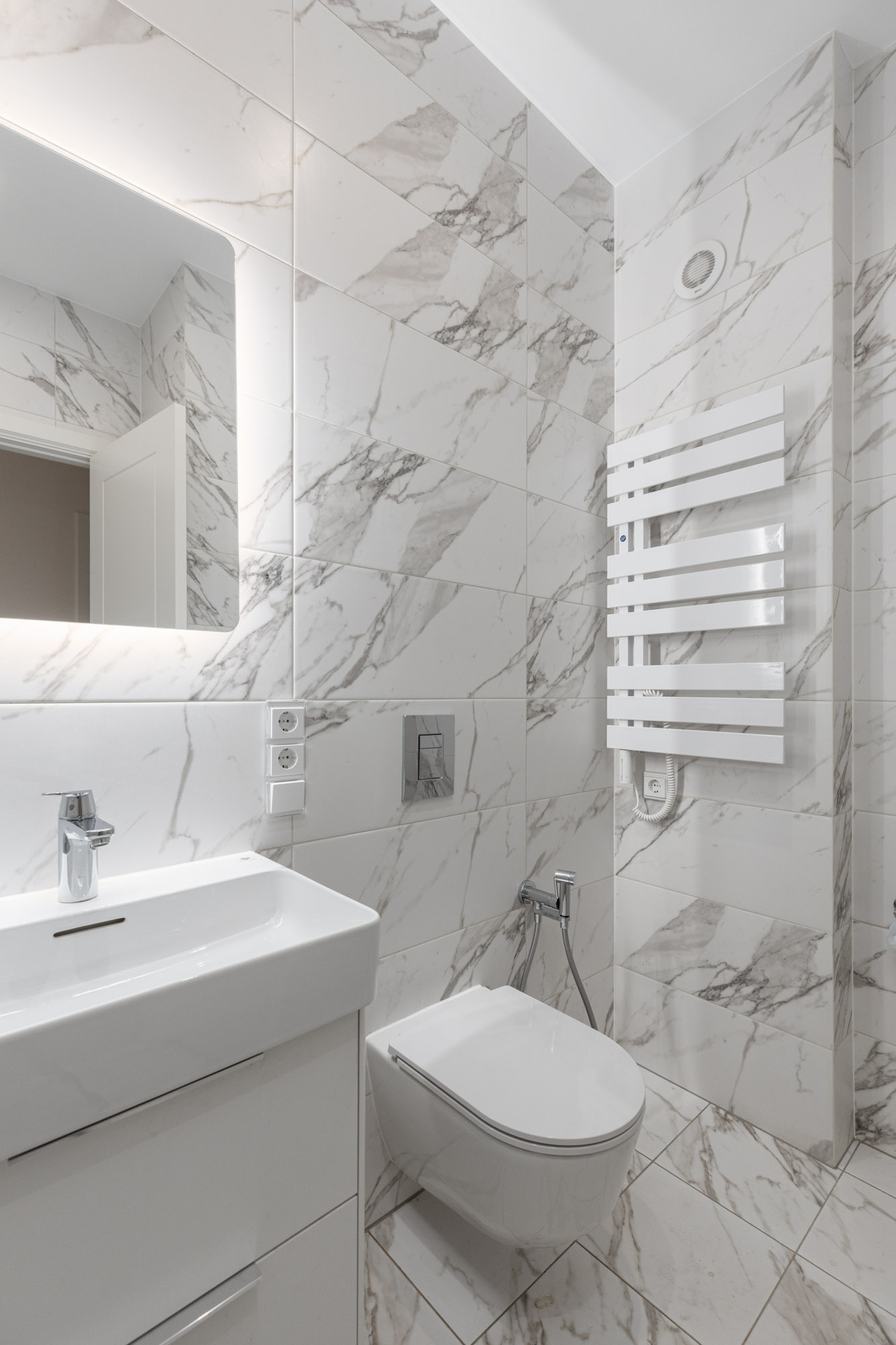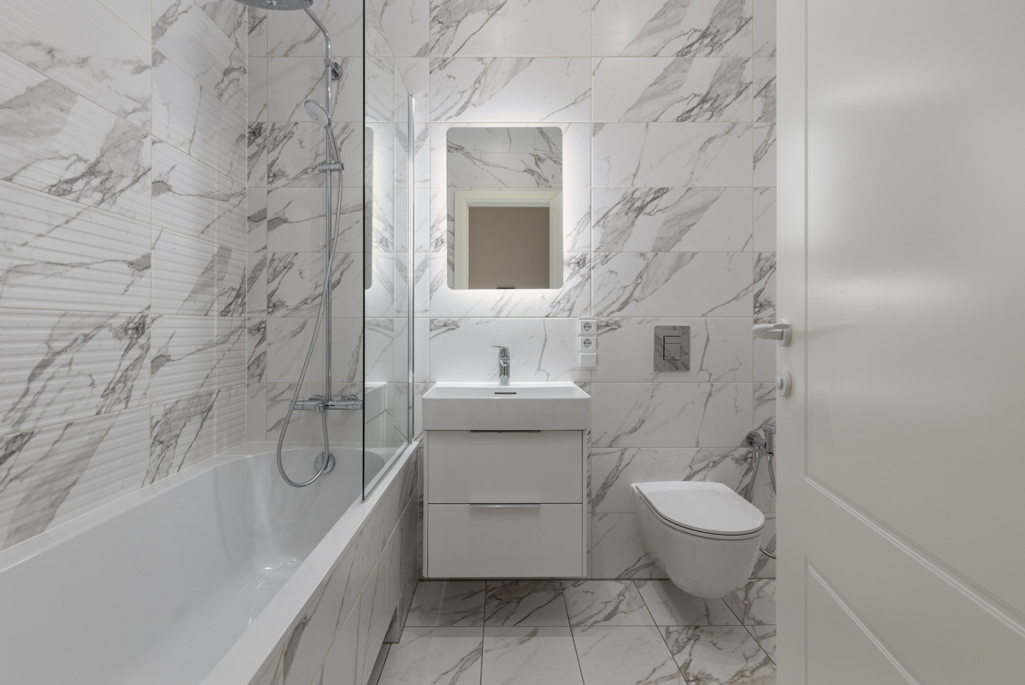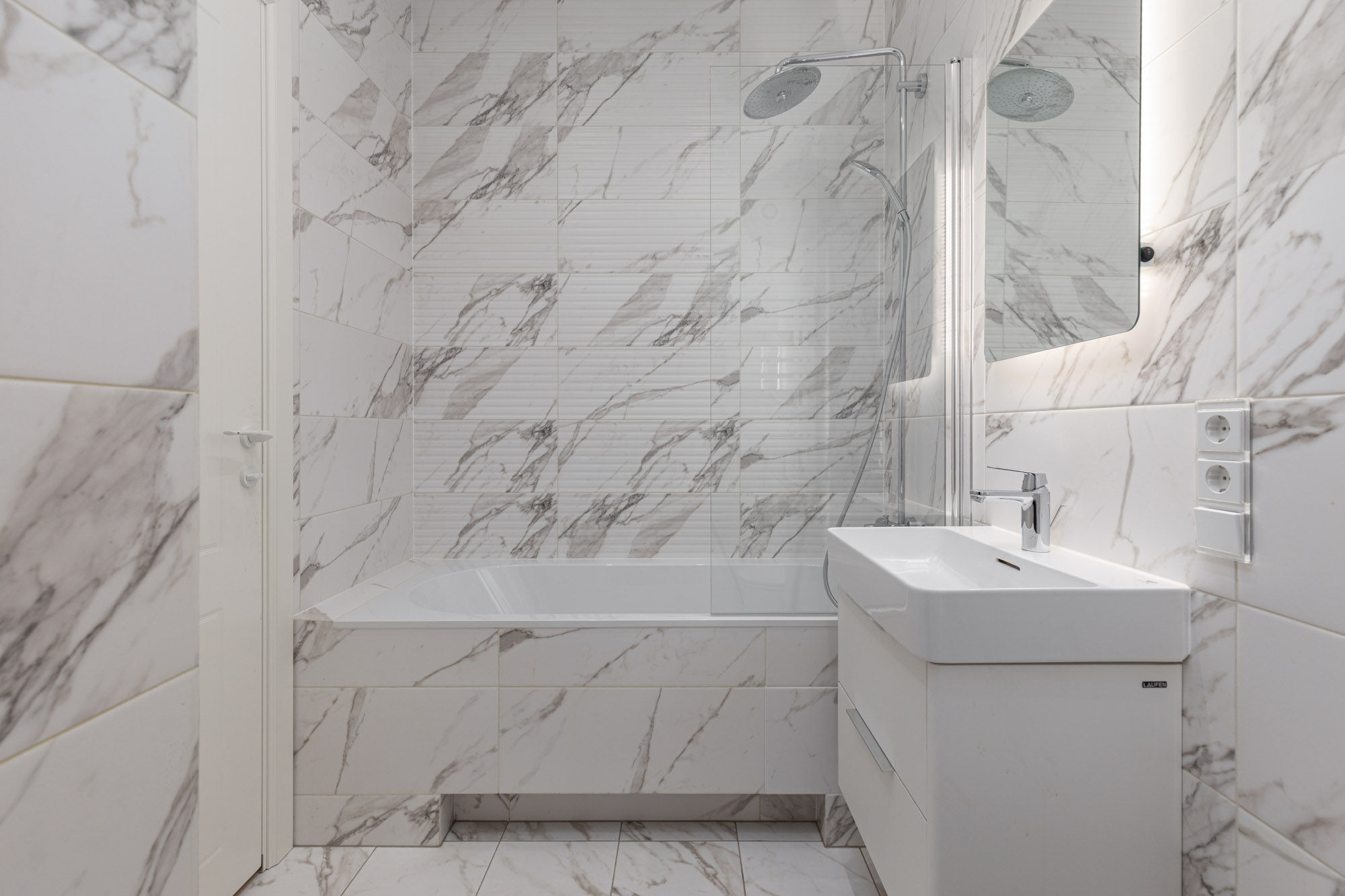 • Vannas istabā – apsildāmās grīdas, augstas kvalitātes santehnika Laufen, Villeroy & Boch, akmens masas vannas, gaišas flīzes, elektriskie dvieļu žāvētāji, spoguļi.